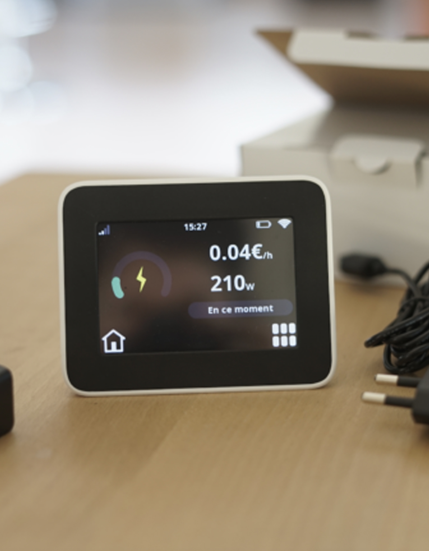 Le capteur se branche sur la prise ERL du compteur Linky et lit les données de consommation du foyer. Le capteur communique avec l’écran déporté pour délivrer en temps réel une information claire et lisible sur l’électricité consommée en puissance et en coût. L’utilisateur peut switcher entre des données en temps réel ou des analyses jour, semaine, mois…